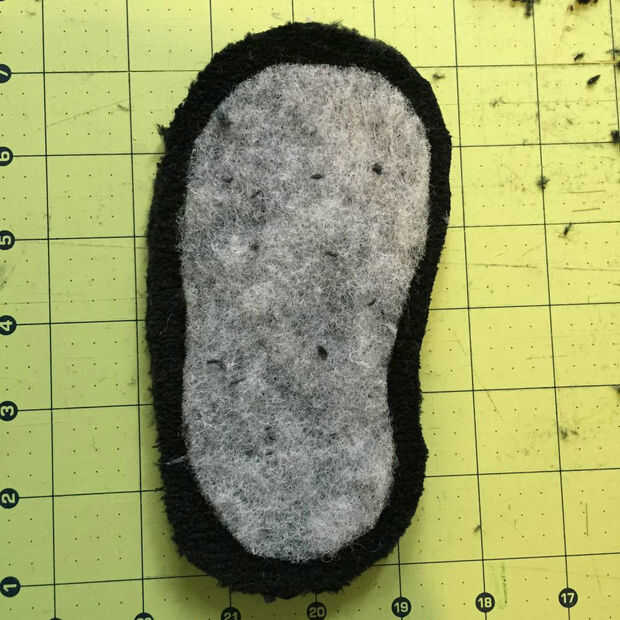 Primero remonta libremente un zapato. Este será el patrón de la suela de la bota. Corte (4) para dos pares espejados. Luego cortar guata (2) con el mismo patrón pero recortar 1/2" lejos del borde como en la imagen. Hacer un sándwich de bateo con los lados mal juntos y coser el borde entero.