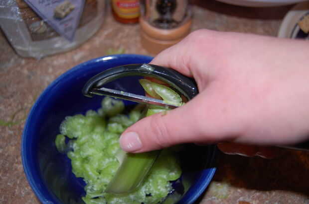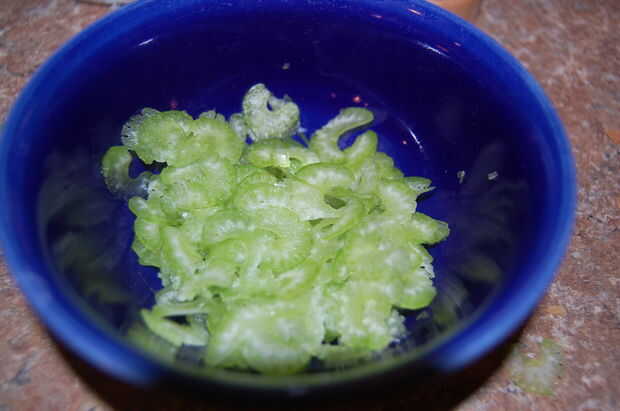Utilice un pelador de verduras para afeitarse abajo en rodajas finas. (No "pelar" la longitud del apio, pero el ancho. De lo contrario obtendrás las fibras largas de apio y es masticable)