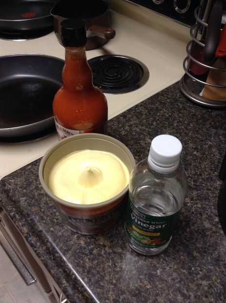 Añadir la mantequilla, espere hasta que derrite primero agregar la salsa (la cantidad depende de lo picante y alas cuantas usted está cocinando con. Añadir un poco de poco de vinagre.