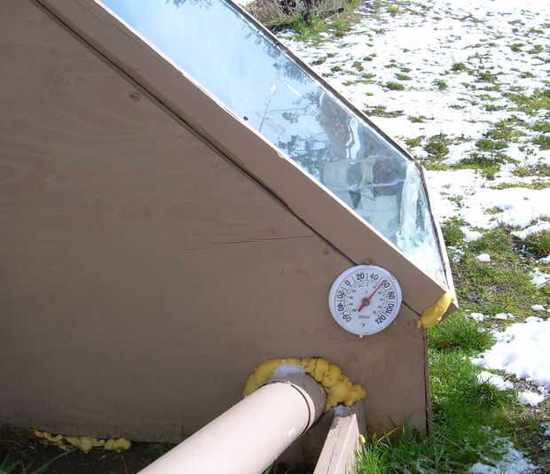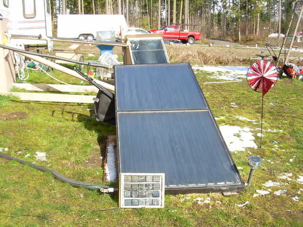 se trata de un agua caliente Solar lote tipo calentador que precalienta el agua de mi tanque de agua caliente dentro de la casa. Costo $45,00 a construir. Hice de garaje venta y artículos de buena voluntad y restos de madera que tenía puesta alrededor. Ha sido agua de calefacción hasta 140 grados y no circula a través del tanque por flujo natural bomba ya es más bajo que el tanque principal.