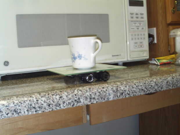 La solución fue una placa en las ruedas. Comida caliente o bebida puede ser sentada en la montaña y rodada fácilmente en el mostrador de la cocina donde el elemento podría ser utilizado. Ahora, fácilmente pude deslizar mi taza de té caliente del microondas en este balanceo caliente la placa y rodar a donde deseaba. Movimiento tazones grandes de alimentos son mucho más fáciles en una placa caliente que rueda.