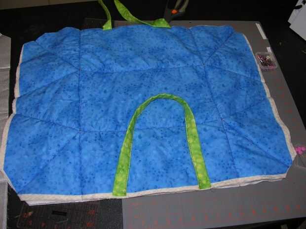 En su plataforma, encontrar el centro del lado largo, haga una marca pequeña, luego mida 3" en cualquier lado (extensión total de 6") y pin las correas a la almohadilla en el lado de la tela de moda – bordes brutos bordes crudos, el lazo de la correa en el centro.