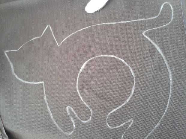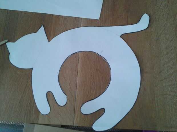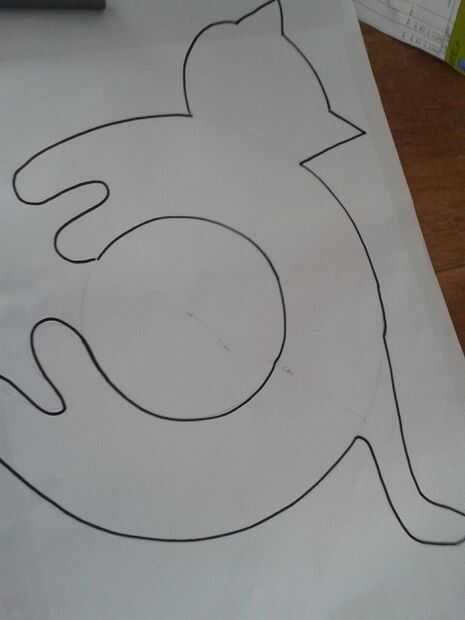 Dibujar en un círculos de papel 2 en uno a con diámetro de 7 y 15 (o más) cm. (= 2.8 y 5,9 pulgadas). Puede hacer que el círculo externo más grande para un Gato gordo. Dibuja pies, cabeza y cola como en la imagen. Cortar el patrón. Dibujar el patrón 2 veces en la tela y cortar.