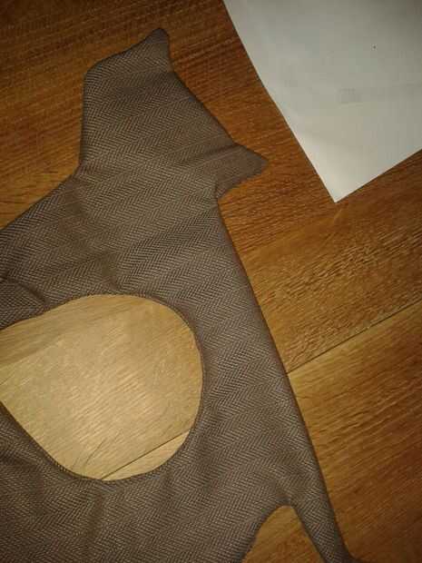 Vuelta adentro hacia fuera. Tire de la tela a través de la abertura. Puede utilizar un lápiz para empujar los oídos, pies y cola de gato. Llene el gato con el arroz de cereza hoyos con el embudo a través de la abertura. Coser la abertura. Hecho!