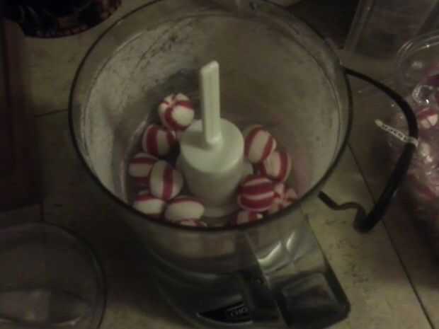 Aplastar a bastones de caramelo con procesador de alimento hasta que las piezas están curso y colocar en un tazón pequeño. No tengo una cantidad exacta así que procesados lo suficiente como para cubrir la cantidad de bombones que yo iba a usar.