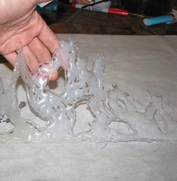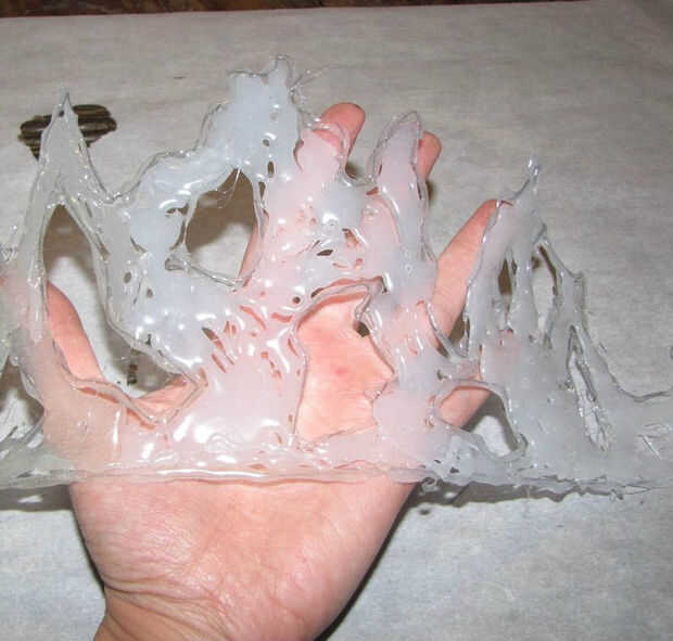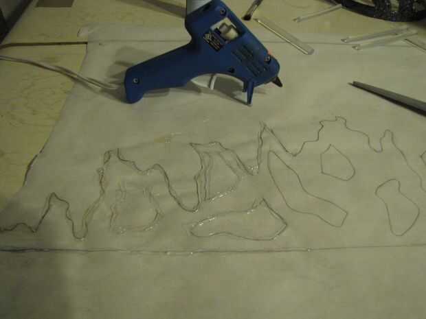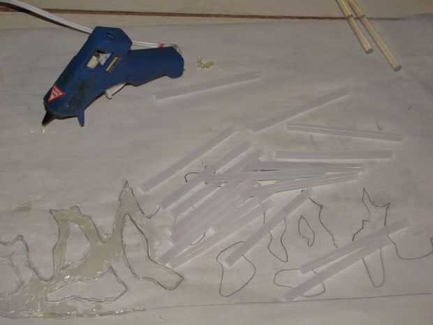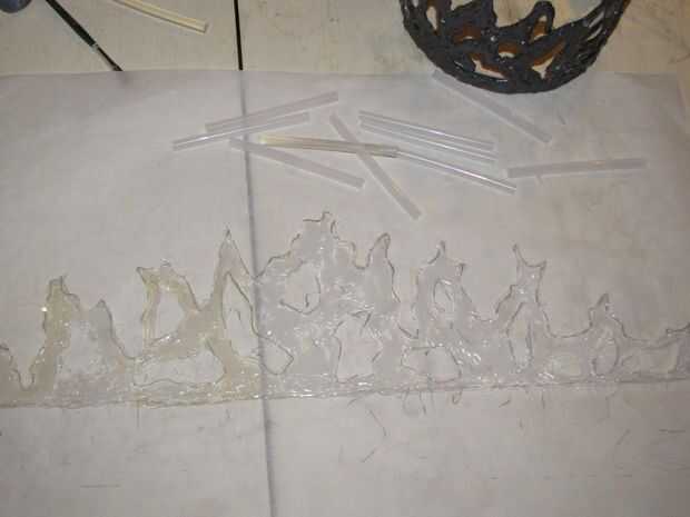 Cortar un trozo de papel de pergamino que es grande bastante para caber toda su corona mentira plana. Usted puede cortar pegamento caliente muy fácilmente cuando está seca que permite que puede cortar su corona a su tamaño si es necesario. Dibujar el contorno de su corona en el papel de pergamino. Utilicé una regla para trazar una línea recta por el borde inferior de la corona. Desde allí, ser creativo. Dibujar cualquier forma que desee para su corona. Hace referencia a imágenes de internet para la corona del cisne negro. Una vez que se dibuja el contorno de la corona en el papel pergamino puede empezar a aplicar pegamento caliente. Asegúrese de que tiene algo a prueba de calor bajo el pergamino antes de empezar a aplicar el pegamento caliente. Tengo una vieja mesa de artesanía que usé no estaba preocupado por dañar mi superficie de trabajo. Comencé por trazado sobre el contorno que dibujé con pegamento caliente. El contorno de pegamento caliente actuará como una frontera como comenzar a llenar en el espacio con más pegamento. Haz una capa completa establecida y aplicar una segunda y aun una tercera capa de pegamento caliente para alcanzar el espesor deseado para su corona. Tomó cerca de tres capas. Quería un metal fundido mira por lo que no me preocupaba ser aseado.