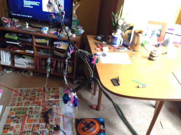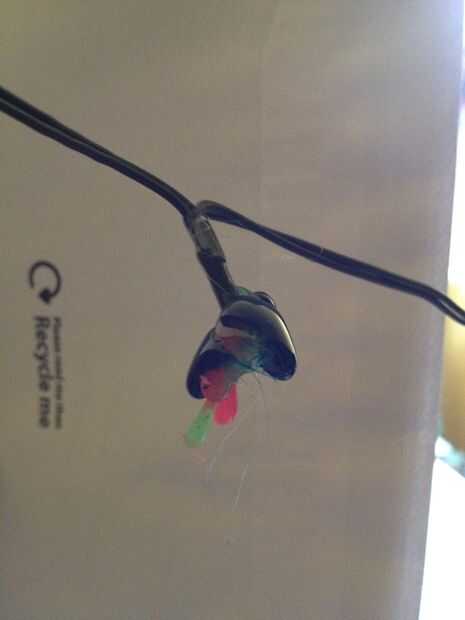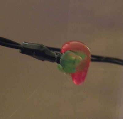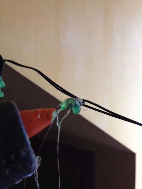 comenzando en un extremo Coloque un poco pequeña de pegamento caliente en cada luz, no más grande que un guisante como demasiado y la mayoría se escurran. trabajar su camino hasta el final poniendo un poco pequeño en cada luz y por el tiempo en que al final el primero debería estar listo para otra gota.