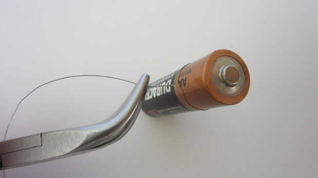 Corte este trozo de cable. Hacer un lazo en cada extremo y gire el lazo para que las dos secciones del alambre se envuelven juntas y hacen una fuerte conexión. Recomiendo usar una batería o un lápiz para retorcer el cable mientras se mantiene el otro extremo con un par de pinzas.