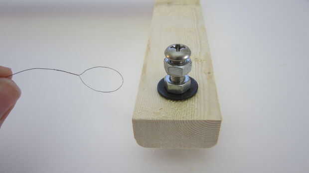 Montar los dos lazos sobre las cabezas de los dos tornillos. Puede girar la tuerca adyacente para ayudar a mantener en su lugar. Pero no la apriete demasiado o puede romper el alambre.