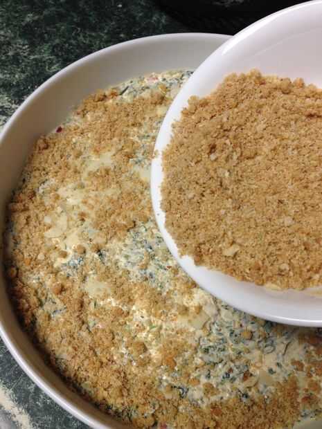 tratar de mezclar bien. Distribuida uniformemente las migas encima de la dip. Utilizar más o menos