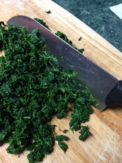 Quitar la toalla de papel y picar las espinacas para evitar las fibras de la longitud del pelo.