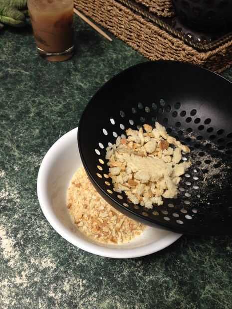 miga más fina, dumping los pedazos más grandes en el tazón de fuente