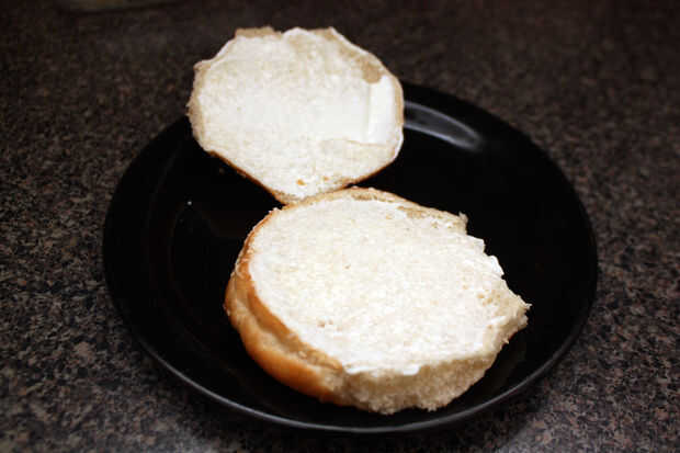 Uniformemente repartidas piezas superior e inferior de la pan de hamburguesa a la mayonesa.