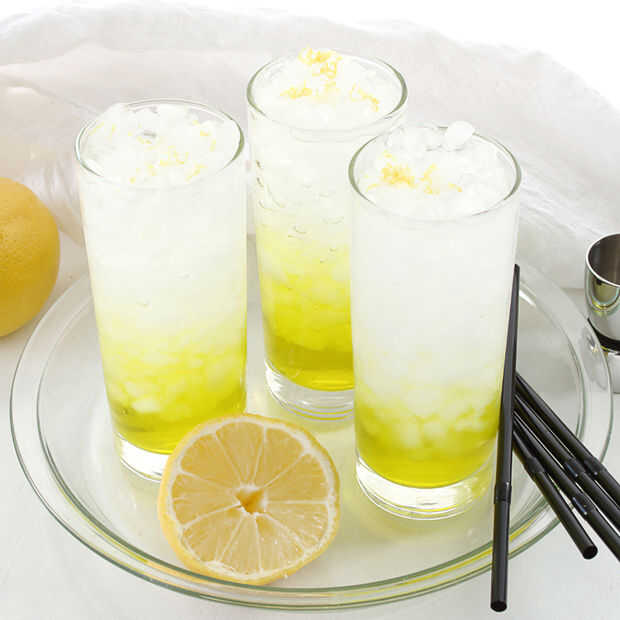 En un vaso Collins con hielo picado, vierta 1 oz limoncello, licor de caramelo ½ oz y 1 oz vodka de pastel de boda.
