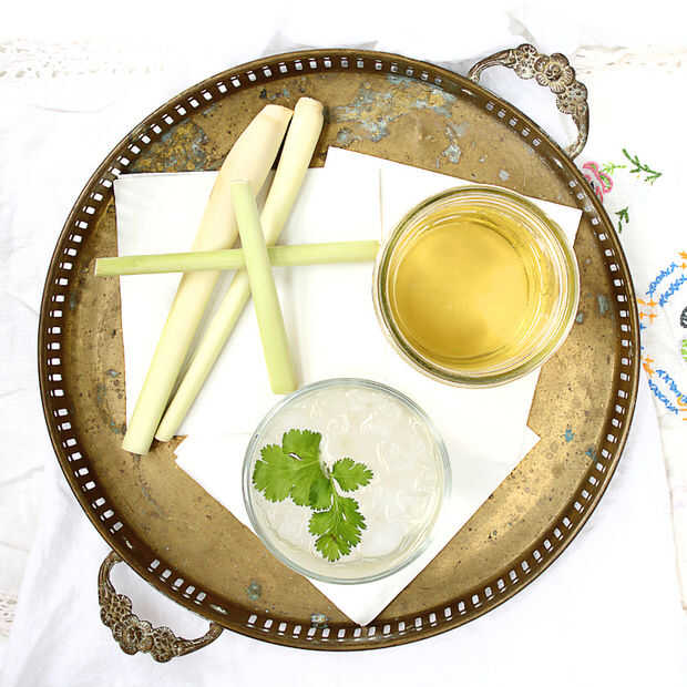 Poner 1 taza de agua a hervir y empinados 2 tallos de hierba de limón machacado (aproximadamente de 4" de largo) durante 30 minutos.Cepa.