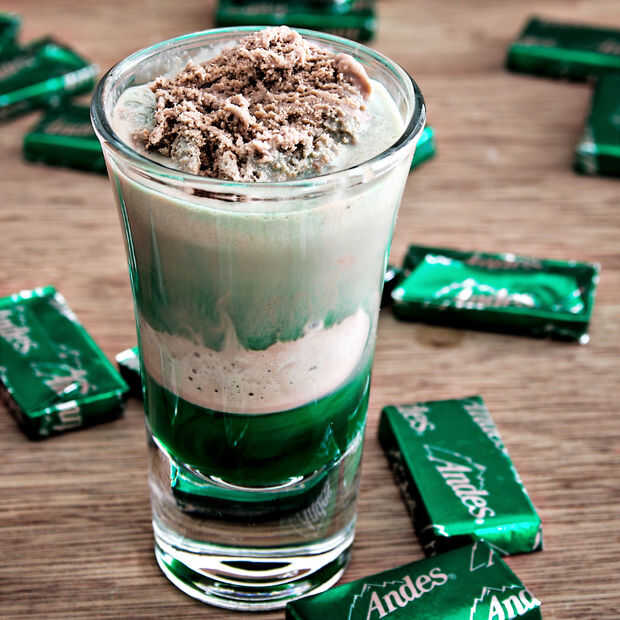 En un 2 oz cordial de vidrio, vierta 1 oz de crema de menta verde y cubrir con una cucharada o dos de helado de chocolate.