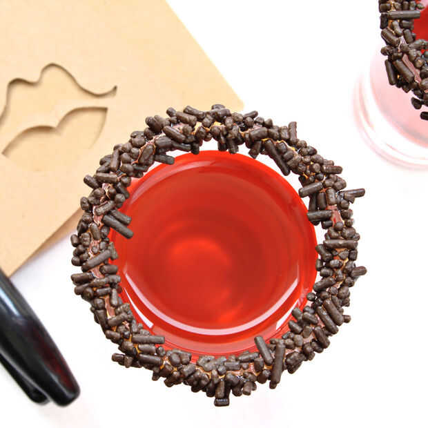Llanta 2 oz cristal cordial con chispitas de chocolate. Usé miel para conseguir que se adhiera correctamente.