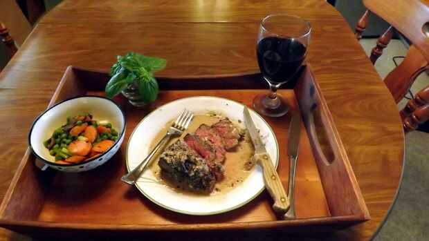 Y lo hice! Oferta Londres asar au Poivre cubierto con una salsa de crema de brandy. Un lado de las zanahorias, champiñones y guisantes ligeramente endulzado con miel y una buena copa de Natura Carmenere (ligeramente afrutado vino rojo de Chile'sValle de Colchagua que mi hija me trajo en su última visita).