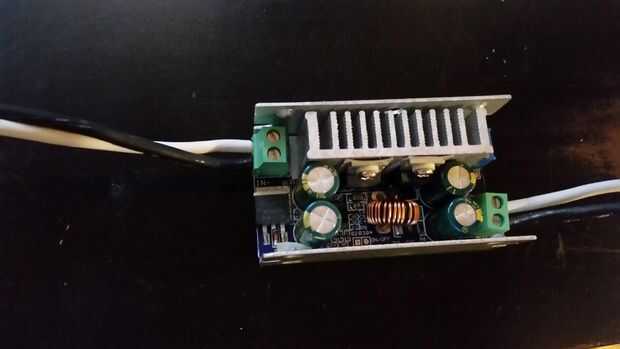 Montaje es bastante sencillo. Desea alimentar a sus terminales de la batería en la entrada del convertidor DC-DC, y conduce hacia fuera desde el convertidor DC-DC a su hilo de la plantilla.