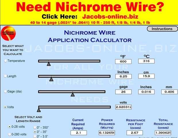Esto es donde puedes tener versatilidad y precisión. Para ello necesitamos utilizar el Jacobs Nicromio alambre calculadora http://www.jacobs-online.biz/nichrome/NichromeCal...