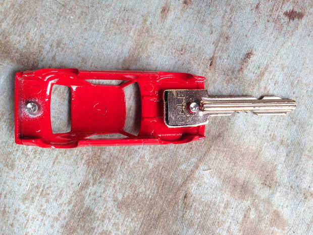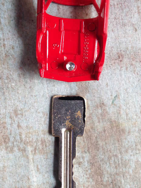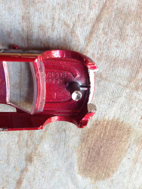 Nota: Como se muestra en la última foto, algunos cuerpos de Hot Wheels tienen el parachoques delantero como parte de la estructura de fundición (a diferencia de una parte del tren de aterrizaje de plástico, como fue el caso de mi coche). En esta situación, usted necesitará utilizar una amoladora o un accesorio de corte de metal para recortar suficientemente lejos del metal parachoques para permitir que la clave caber en el coche.