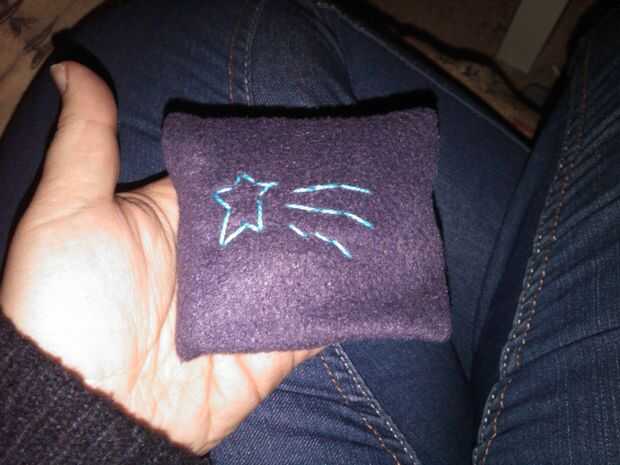 En la púrpura, he creado un motivo estrella fugaz con puntada trasera simple. Obviamente, esto habría sido más fácil hacerlo antes de el paño grueso y suave en el caso...