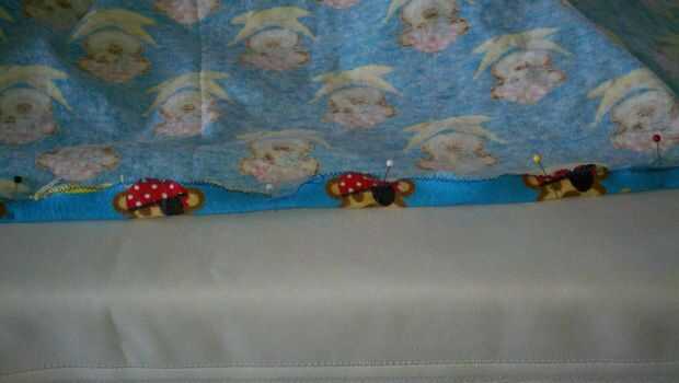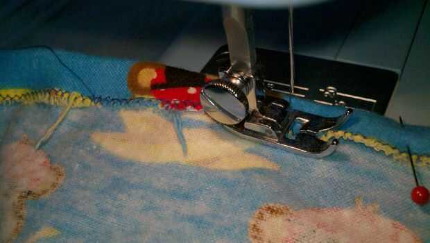 Tampoco puede planchar los bordes hacia abajo solo un poco más de una media pulgada, o simplemente puede prender. Realmente sólo utiliza cerca de 5 pernos y luego mantiene fijando como cosí alrededor del borde. Asegúrese de dejar un espacio de pulgadas 3 o 4 al final por lo que puede del hilo de rosca elástico en. Es más fácil si usted comienza en medio de uno de los lados de las hojas, contra una esquina.