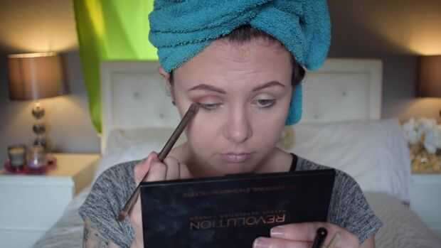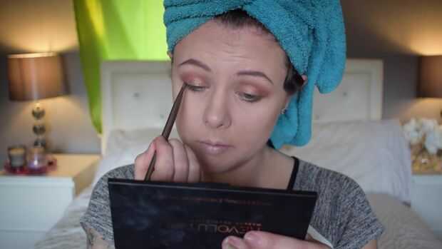 Ahora en los ojos. Primero aplica una sombra naranja cálido para el pliegue del ojo y realmente esta mezcla sin dar también en la línea de pestañas inferior. Luego con una sombra de oro trémulo apliqué esto a la tapa del ojo con un pincel húmedo. Luego con una sombra marrón oscuro apliqué esto a la V externa del ojo y había mezclado esto hacia fuera en el pliegue y tomarlo justo en la línea inferior de pestañas. Me aseguré que después de cada paso que fui con un cepillo suave para asegurarse de que fue mezclado.