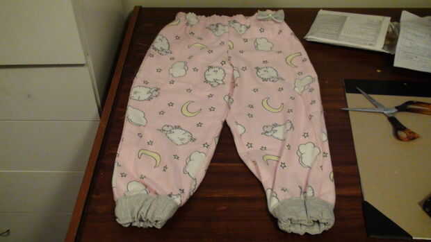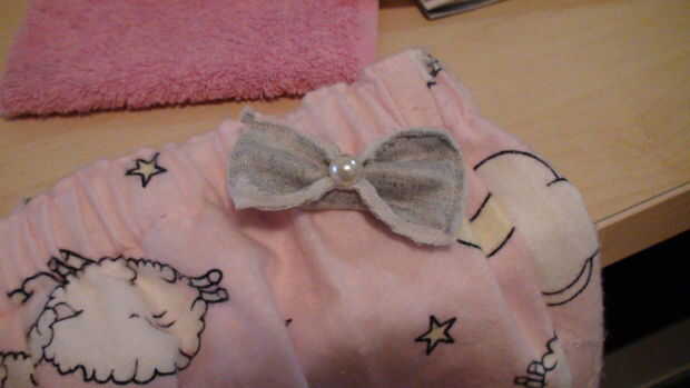 3 utilizando un lugar más grande de pegamento fijar el arco a los pantalones y coloque un pedazo de papel dentro de los pantalones para parar el pegamento se filtre a través de (también puede coser el arco hacia abajo usando una aguja e hilo) una vez que el pegamento se seca el pantalón está listo para ser usado.