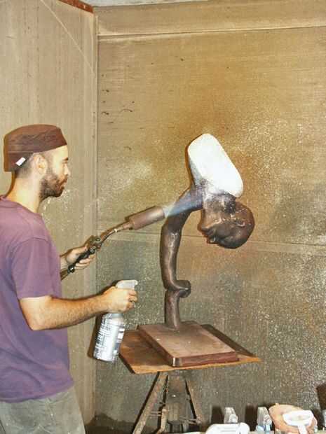 Calentar uniformemente el bronce. Todos los pasos son importantes, pero nada puede arruinar una pátina más rápido que tener puntos calientes. Calentar toda la pieza a un amarillo pajizo o color miel oro y luego dejamos que se enfríe un poco. Bronce es un buen conductor y el calor se disipará rápidamente para eliminar las zonas calientes. El metal debe ser lo suficientemente caliente como para que agua chisporrotee pero no bola encima y escurr (algo así como cuando solía escupir sobre una plancha de ropa cuando era un niño). Puede probar la temperatura por cepillado o rociar un poco de agua limpiado en la superficie. Nitrato básico de bismuto se aplica primero con una botella de spray para darle una capa de blanco opaca. Ten en cuenta que se aplicarán varias capas de productos químicos hasta construir el bismuto lo suficiente para que el bronce está cubierto pero no más. Si el bismuto se pone demasiado espeso, los productos químicos aplicados en la parte superior tienden a desprenderse, porque no es capaz de crear una unión química a la de bronce.