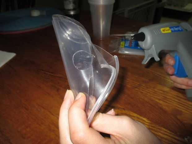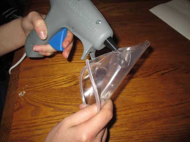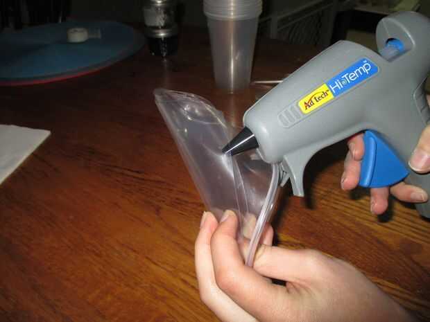 Ahora que tienes el sobre forma, sostener con una mano sujete la parte inferior de la misma. Tome la pistola de pegamento caliente y poner pegamento caliente entre los dos lados donde tocan. Encontrar los lugares donde el pegamento caliente permitirá la copa en esta forma. Ser generoso con el pegamento caliente. Mejor se queda juntos que hacer estallar nuevamente dentro de su original forma de copa.