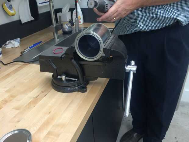 Colocar la lata en un tornillo de banco o abrazadera de alguna otra manera y cortar alrededor con las marcas de centro para guiarlo. Utilicé un disco de corte en una herramienta giratoria, pero si tienes unas tijeras para chapa u otra forma de cortar a través de metal puede utilizar en lugar de otro.