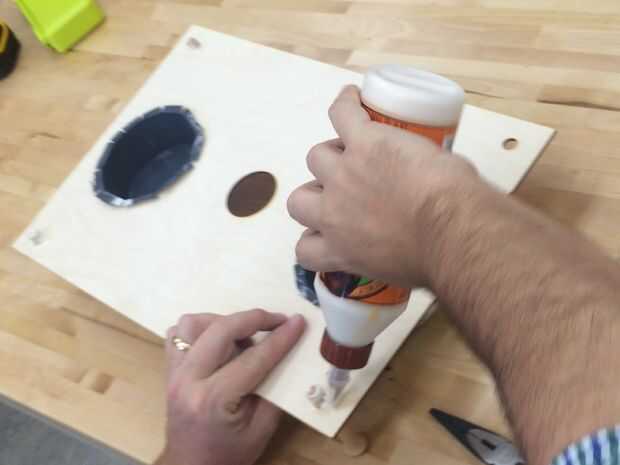 Utilice pegamento de carpintero o de epoxy para agregar las clavijas de la coctelera como piernas. Si lo desea, corte las espigas hacia abajo primero el espesor de la base, o dejan sobresale!