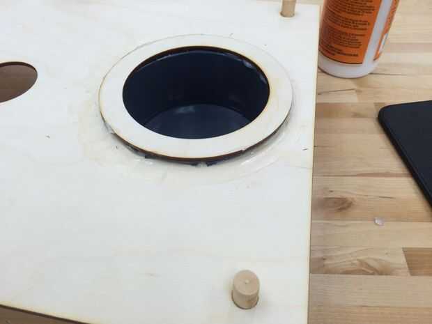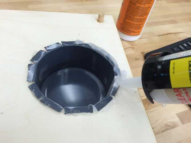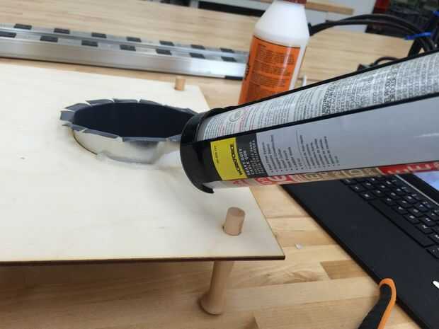 Coloque una segunda tira todo el camino alrededor de la parte superior de las aletas y luego colocar el anillo de cubierta de madera en la parte superior, centrando lo mejor posible. Aplastar el anillo hacia abajo y utilizar algunos desechos para eliminar el exceso de silicón que rezuma hacia fuera.