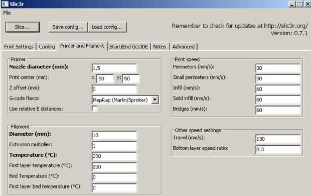 Aquí están algunas opciones para jugar con mientras se calibra. Éstos se ilustran a continuación en el Slic3r capturas de pantalla de configuración: