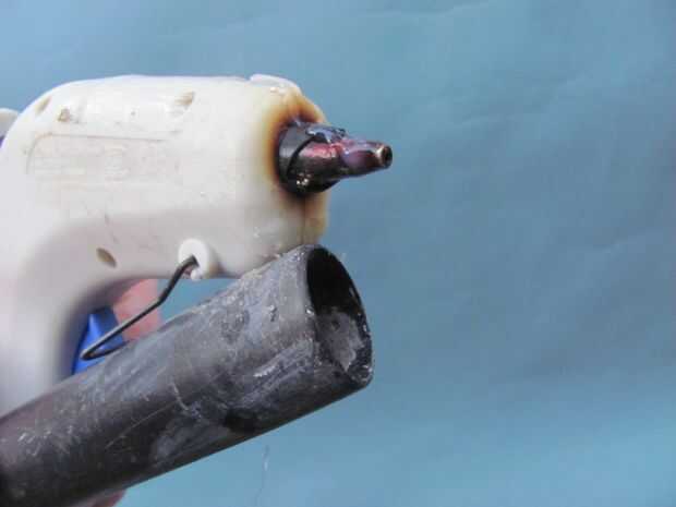 2. Encienda la aspiradora y coloque la manguera de modo que el aire sople hacia fuera debajo de la punta de la pistola de pegamento.