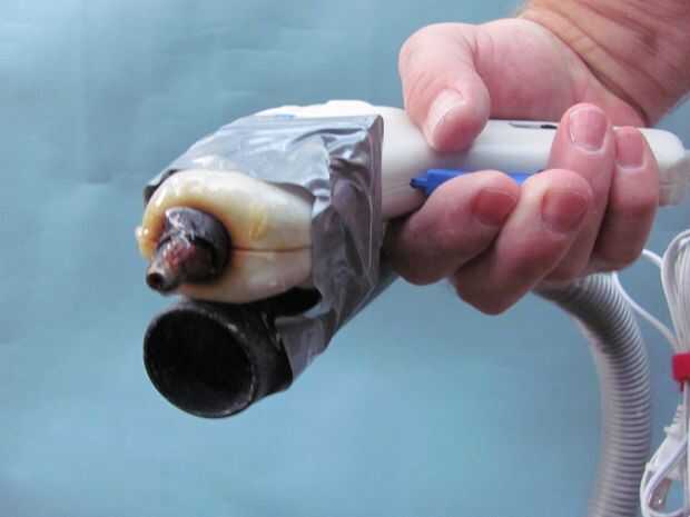 Puede que desee en cinta o amarra la manguera de vacío en lugar de la pistola de pegamento, pero he encontrado no es tan difícil para sostenerla justo donde usted lo necesita. (Tenga en cuenta que es perfectamente aceptable para la posición/montaje de la manguera de aire en el lado de la pistola encoladora y sostenga la tela de araña 'pistola' hacia los lados para que el pegamento gotea en la trayectoria del aire).