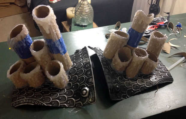 En mi caso la curva de los escudos de juguete hacer hombreras muy natural para mí. Por lo que no les enderece ni doblarlas salí con su curva natural y había ajustado a la forma correcta. Cortar los fondos de algunos de los rollos de cartón para ayudarles a ser más al ras de la plataforma. Me decidí en la diferencia de altura y el arreglo y luego simplemente pegan los rollos hasta la plataforma.