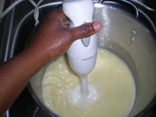 Este paso es más fácil si tienes una batidora de mano. Jabón líquido tarda un poco más a trazas de jabones en barra. En promedio, me tarda unos 15 minutos de encendido y apagado de mezcla para llegar a rastro. Tenga cuidado de no desgastar su licuadora. Una vez que comienza está calentando, es hora de tomar un descanso.