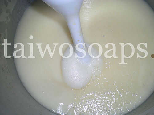 Esto es lo que 'traza' en jabón líquido (Foto 2). Se parece un poco de compota de manzana, gruesa y fangosa. Es cuando su acción haya espesado lo suficiente como para elevar la cuchara/licuadora y trail 'traza' en la bolsa.