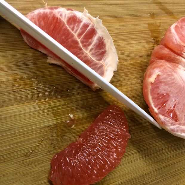 Preparar sus cítricos. Separar el pomelo ruby en secciones y pelar las secciones para que se vean verlas. La forma más sencilla de hacerlo es cortar la tira resistente de la membrana en el borde del plano, que libera a los lados a la cáscara de. Cortar el pomelo bonito en trozos pequeños.