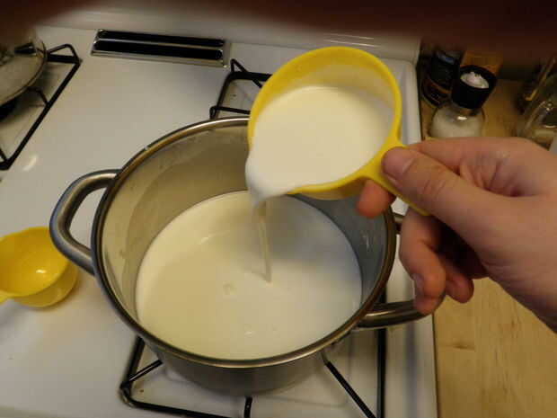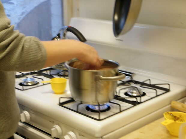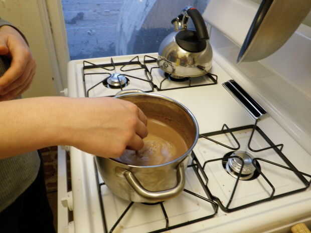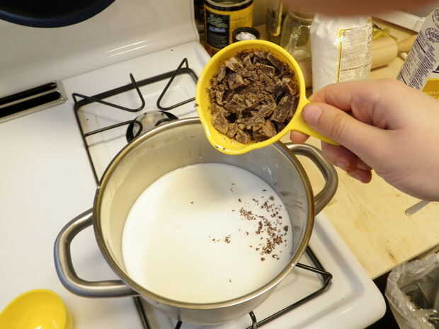 A continuación, añadir el chocolate en pequeñas adiciones, revolviendo constantemente. Seguir añadiendo chocolate hasta su fondo fundida en.
