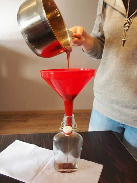 Esto es muy fácil sólo hay que poner el embudo en la botella y vierta a través de la salsa que seguro pones tanto como sea posible en la botella.