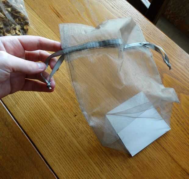 Tire las cuerdas para cerrar bien la bolsita, no asegurando mezcla seca puede derramarse.