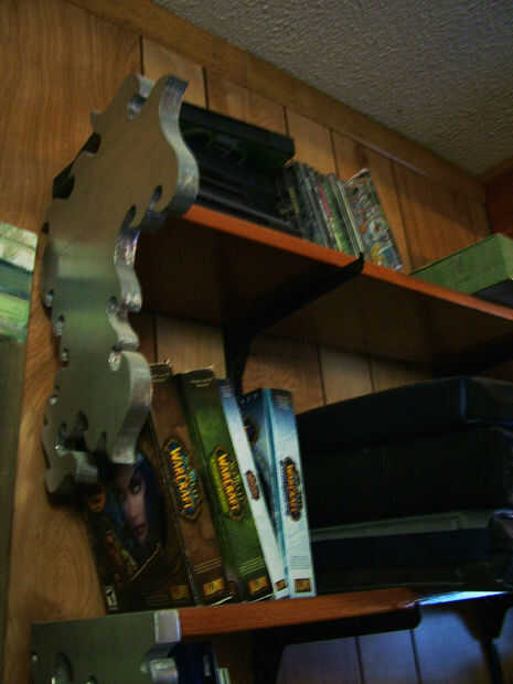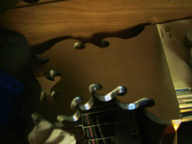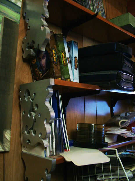 dibujar estantes diseño en papel, escanear en PC, Editar imagen para crear una plantilla de, imprimir plantilla, utilice la plantilla en material real como la madera, utilizar Sierra de contornear para cortar diseño de plantilla, medir bien, unir piezas con pasadores, pintura y laca.