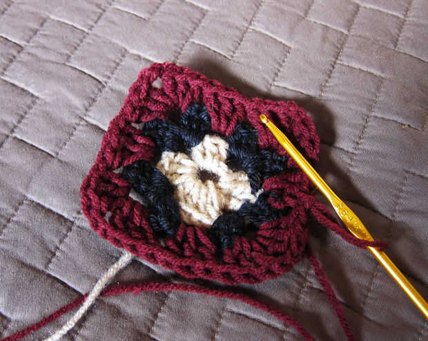 En este punto estás listo para una esquina, a punto bajo y luego tres crochet doble. Hacer esto dos veces más y cerrar el lazo. Debe tener una plaza que parece que tiene cuatro pétalos.