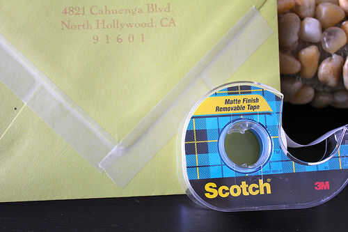 Para esto, recomiendo la cinta Scotch removible. Tomar dos trocitos, virar la aleta de la envoltura hacia abajo, y se ejecuta a través de la impresora como un encanto. No más interferencia. Luego, cuando haya terminado, usted puede sacar la cinta sin dañar el papel.