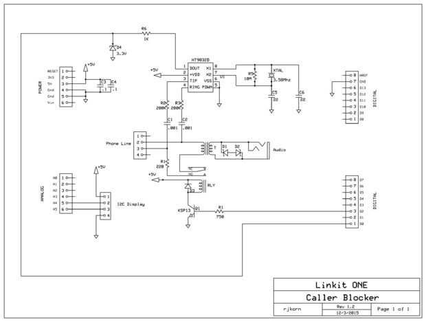 Hay un montón de piezas aquí pero es realmente un conjunto muy simple de bloques del circuito. Un transistor conduciendo un relé de un pin de I/O digital, un chip de módem analógico y componentes de apoyo, una rúbrica para un display I2C, además generalmente condensadores de desacople y diodos de protección.