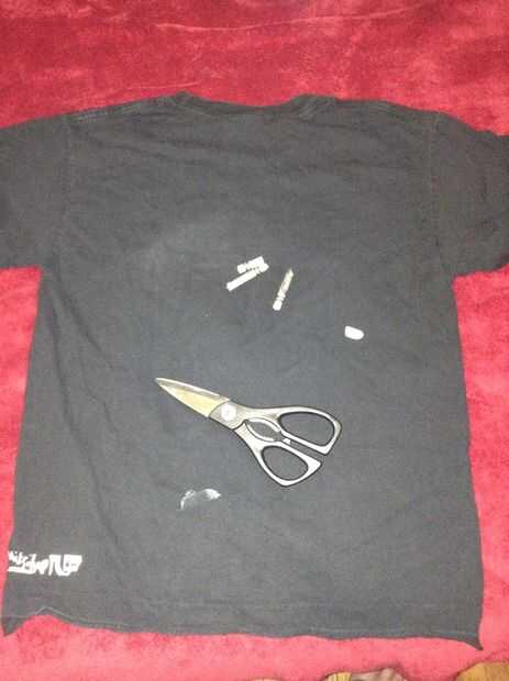 Para hacer esto usted necesitará: -A camisa negra que ya no se adapta a usted o usted quiere deshacerse de -un pastel de aceite blanco o un crayón blanco -tijeras -una buena superficie para trabajar en