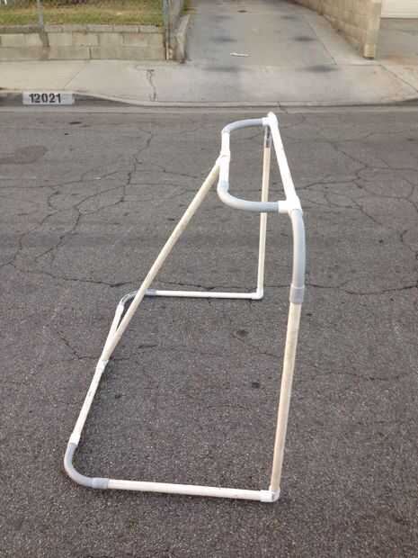 tienen un montón de palos de hockey usado de las calles?Corte cada palillo 8" más corto que el otro.Tornillo o cinta adhesiva junto (varían los ángulos) y Monte el conjunto en una base.Listo.Estante de la capa.